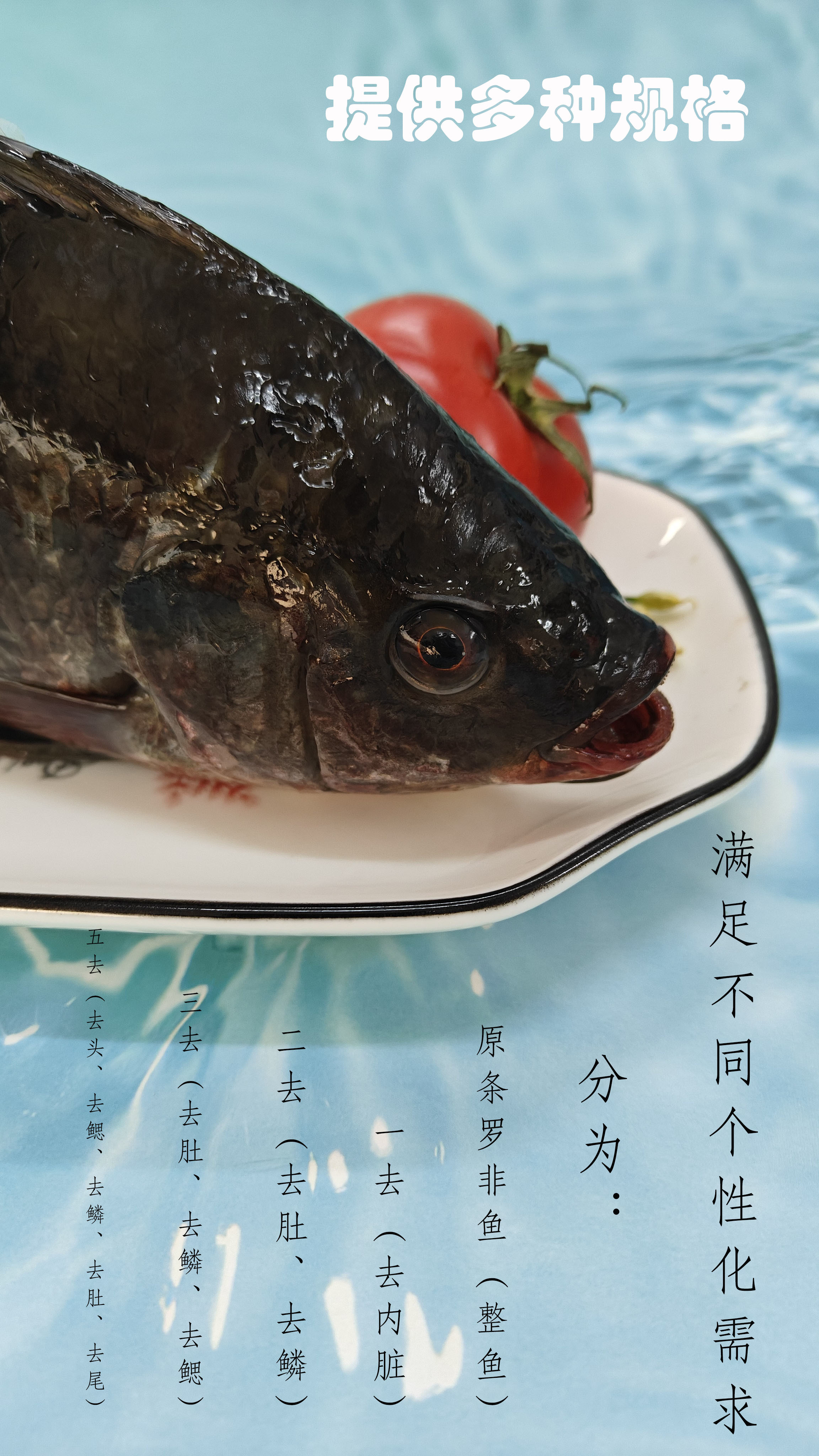 原條羅非魚(整條);一去(去內(nèi)臟);二去(去肚,去鱗);三去(去肚,去鱗,去鰓);五去(去頭,去鰓,去鱗,去肚,去尾)。